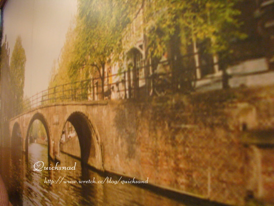 店內的裝潢很簡單,放了一些畫,我們靠坐的這面牆壁則是用很大的畫作當裝飾,我對德國不熟,不知道這是不是德國某一隅。