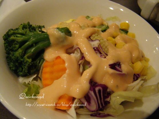 就像一般的生菜沙拉,沙拉醬是千島醬,應該是現成不是自己調的,不過生菜很新鮮,吃起來很鮮脆。