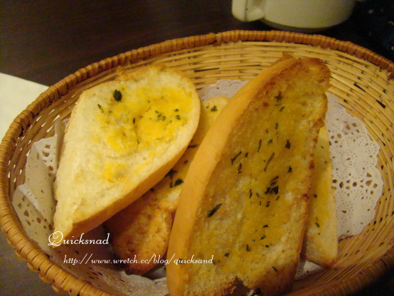 大蒜麵包。原本他附的是飯,我以為可以換成麵可是老闆說是換成麵包,烤得很香脆,可惜有點冷掉了,應該不是現烤的。