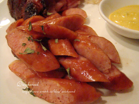 香腸的口感我很喜歡,外層有脆脆的感覺,咬進去則是相Q有彈性,且煙燻的味道很恰當,吃起來口感很不錯,再加上我一向比較喜歡吃熱狗、德國香腸而不喜歡吃我們的香腸,所以更覺得好吃了。