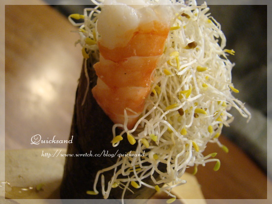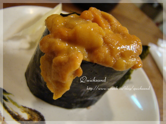 海膽軍艦,就是一個字:讚。他不像東雨是一大片的海膽,而是一小團一小團,可是口感很細,吃起來鮮甜留香,差點沒暈過去。