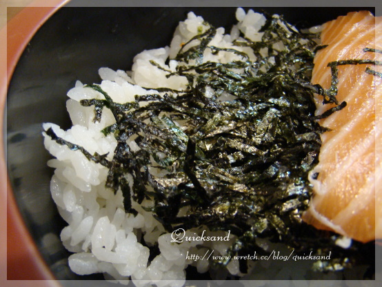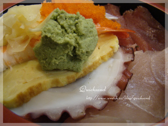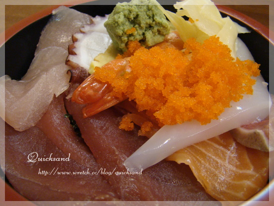 我每次吃得生魚蓋飯:兩片鮪魚,鮭魚、旗魚、紅甘、小卷、章魚,玉子燒、蝦子各一,另外還有蝦卵,原本應該是鮭魚卵,可是我覺得吃起來的味道實在太像我小時候吃得魚肝油,很害怕那個味道,所以就大卵換小卵。