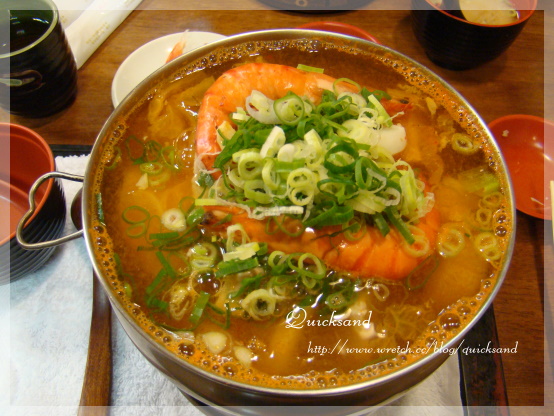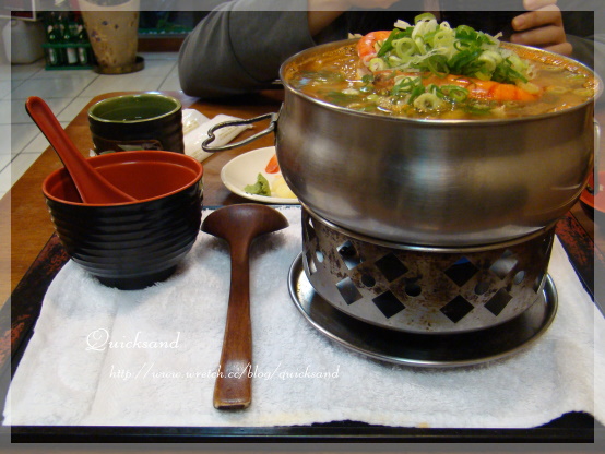 老游的泡菜海鮮鍋。這道餐點上的很慢,我幾乎都已經把我的部份要吃完了老游才開始吃。有兩支蝦子,煮得有點稍嫌過老,湯頭的滋味沒話說,泡菜的味道雖然稍鹹淡了一點,但我也決派這道餐剛好,因為過重的泡菜味會吃不出海鮮的鮮甜味道,過內的海鮮魚貨都是用生魚片的肉下去烹煮,掀新的程度自然是沒話說,搭配上適度的號菜味和剛好的辣味,正襯托出海產的鮮甜,湯頭配合起來也很棒。