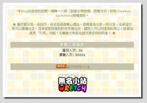 <img src="http://pic.pimg.tw/quicksand/1175699343.jpg" align="absMiddle" /><br /><br />非常難得,我的無名部落格堂堂邁入三萬人次。<br /><!-- more --><br />其實,我的部落閣應該可以說是默默無名(不愧是無名小站),不過每天還是有些不認識和認識的人來給我捧場雖然都不太出聲,不過從人次可以到來往的過客所留下的小小痕跡。<br /><br /><br />我會繼續努力。<br /><br /><br /><br /><br /><br /><br /><br /><br />